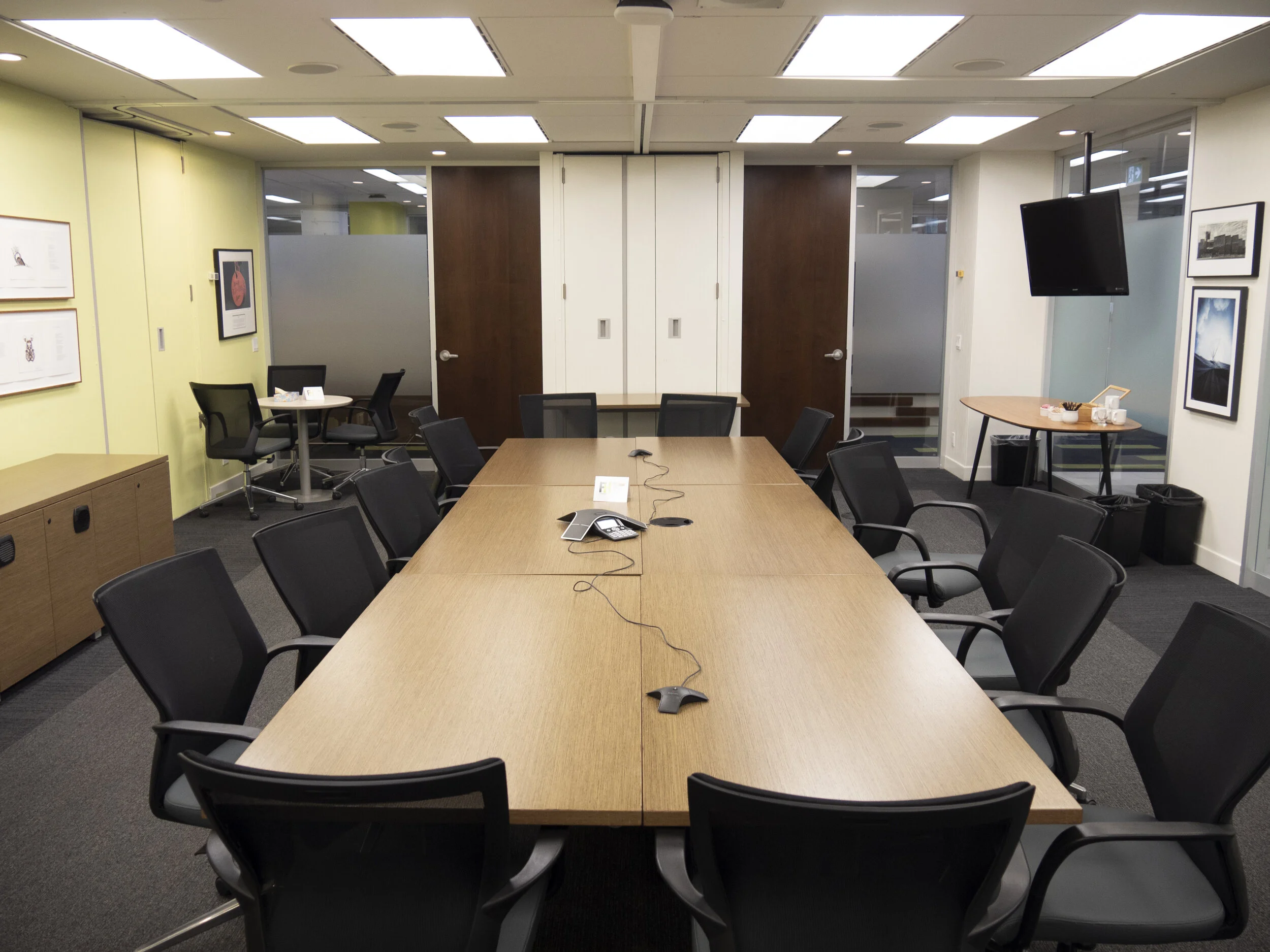 The boardroom can hold 32 people in a cluster style set up, and 24 people in a boardroom set up. A Polycom conference phone is available, with satellite microphones.